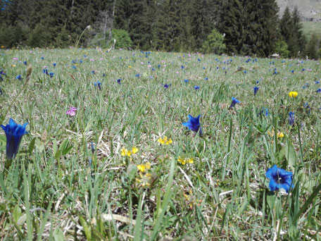 Der Frühlingsenzian blüht und wir sind unterwegs über Wiesen und durch Wälder, spüren den beginnenden Frühsommer in den Bergen. Ein kleiner Gipfel soll für unsere Brotzeitrast das Ziel sein, mit nahen Blicken in die Blütenpracht und weiten Ausblicken in die Berge.