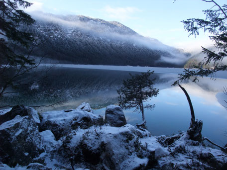 Kaum noch Licht in den dämmrigen Dezembertagen. Der Bergwald ist jetzt dunkel und mystisch. Erst am Nachmittag steigen wir über alte Wurzelpfade zu einem Kraftort hinauf. Dort genießen wir den Ausblick ins Tal, auf den See. In der einbrechenden Dämmerung gibt es frisch zubereiteten Punsch und einen Bergadvent, den jede für sich hier oben erleben ganz besonders erleben kann.