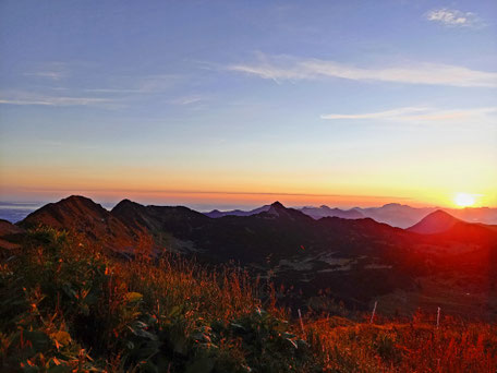 ...eine intensive Erfahrung, den Sonnenaufgang über den Gipfeln zu erleben. Die Nacht verbringen wir im bewirtschafteten Berghaus, loslaufen im Dunkeln. In der Dämmerung sucht sich Jede ihren eigenen Platz, die ersten Strahlen und die Verbundenheit mit der Natur ganz für sich aufnehmend. Der Aufstieg wird belohnt mit einzigartigen Aussichten. Und wenn dann die Sonne über die Berge leuchtet, halten wir ein warmes Getränk in den Händen und das Gesicht in ihre wärmende Kraft.